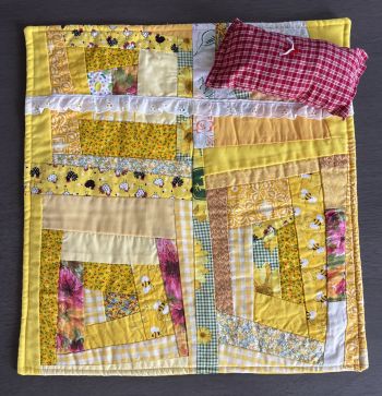 Hand sewn and quilted 17” x 17” blanket or table mat. Solid yellow backing. This set can be used as a doll blanket and pillow. Or as a table mat and give the pillow to your favorite kitty to use as a kick toy! 12.00