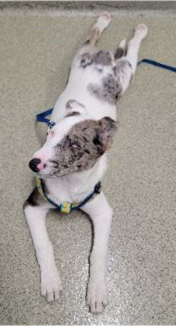 Glitch absolutely loves children and is a very personable girl who also enjoys snuggling next to her people. She is not a high energy dog but would do well with an active family/person or a laid back quiet home as well.